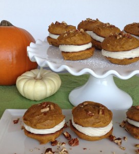 These whoopie pies are the perfect sweet treats- full of Fall flavors. I dropped them off at my boyfriend’s office and they were literally gone within seconds! The cookies have a wonderfully moist, cake-like consistency and the maple whiskey frosting is so elegant and impresive. Best of all, they are incredibly easy to make! Make the cookie batter first, and while they are baking you can quickly whip up the filling. I opted to sprinkle some crushed candied pecans on top for that extra special touch, but leaving them plain would be just as delicious!